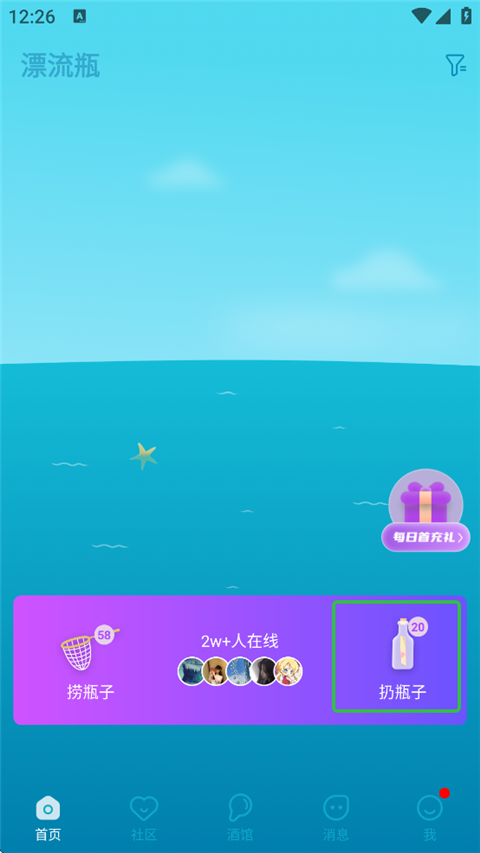 3、点击扔瓶子,用户可发送自己的漂流瓶。