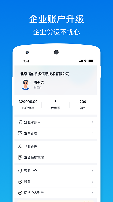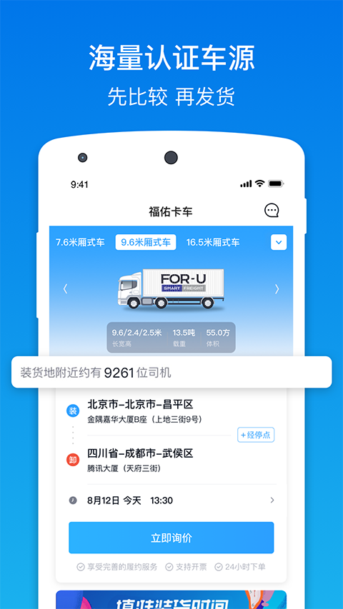 1、福佑承运,保障运输安全准时。 2、海量运力,超50万+货车资源。 3、质优价美,大量节省运输成本。常见问题