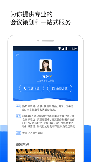 1、提供50个热门城市的数百位会议顾问,免费获取活动方案。 2、中国最大的会场搜索和预订平台,提供全国酒店和特色场地的档期、价格查询和预订。 3、提供标准会议包套餐,场地及餐饮费用一价全包,省钱省时间。 4、透明无中介费,不存在酒店佣金。 5、资深会务顾问帮找会场,为您省钱省力 6、15分钟拿到好的方案和报价。更新日志