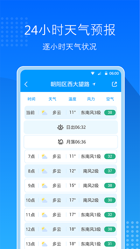【实时天气信息】实时获取您当前位置的天气预报和空气质量污染指数; 【逐小时天气预报】轻松查阅24小时内天气变化,提早预防早晚温差过大; 【15日天气预报】15日天气,风向,温度,空气质量预报; 【空气质量预报】分时空气质量和未来5天空气质量信息查询; 【桌面天气】提供多种桌面天气主题,打开手机即可查看天气; 【气象灾害预警】异常天气情况及时提醒,帮助您及时做好防范; 【语音播报天气】地方话播报天气情况,东北话,四川话,广东话等多种方言任你选。 【更多功能】日历,钓鱼,穿衣推荐,健康养生知识等贴心功能,一应俱全。天气预报通APP使用教程