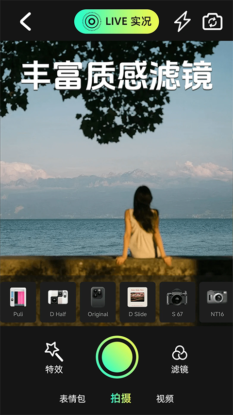 1、实时美颜,视频磨皮算什么美颜,要的是硬币眼、细高鼻、巴掌脸、大白牙。 2、卖萌贴纸,无他相机的贴纸萌到没边儿。 3、多脸美化,用户带上你的闺蜜一起拍吧,这次不会翻船了。 4、滤镜多种多样,满足你的各种需求。实况动图相机app使用教程