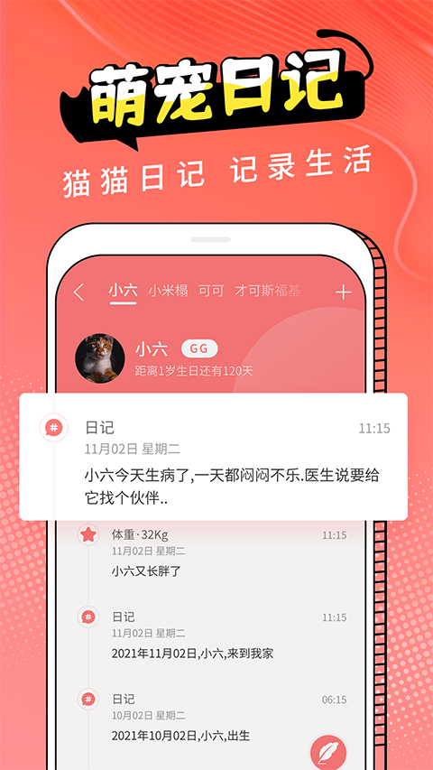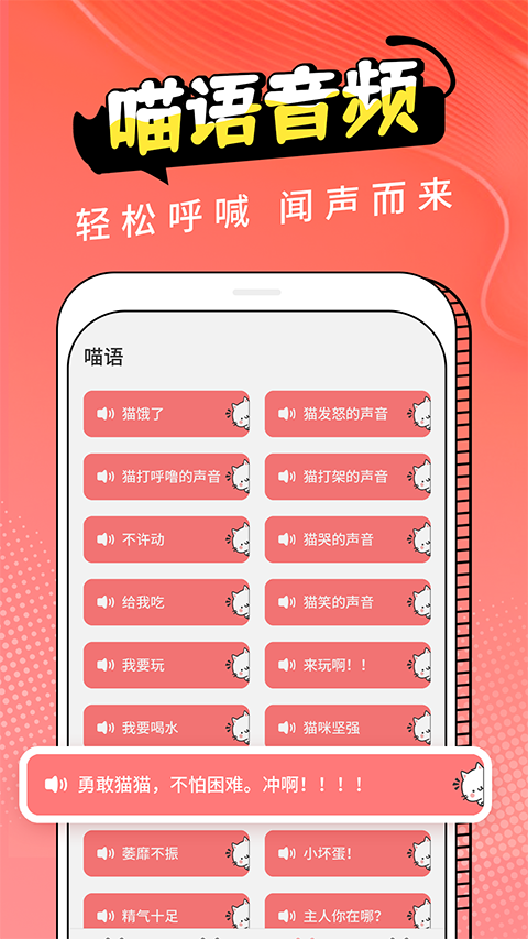 1、人猫互动 根据声音强弱高低和频率,判断情绪,人猫间互动翻译。 2、萌宠丑照 通过内置小游戏,吸引宠物触碰,获取不同视角下它们憨憨的样子。 3、播放声音 通过播放动物声音,吸引宠物注意。 4、收藏美好 如果有小动物们有趣的声音可以保存记录下来应用亮点