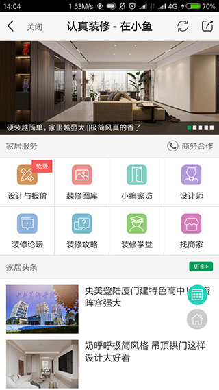 4、有没有在为装修烦恼呢?别担心,认真装修就在小鱼!这里有很多家居服务包括设计与报价、装修攻略和家居头条等诸多内容,帮您打造完美新家