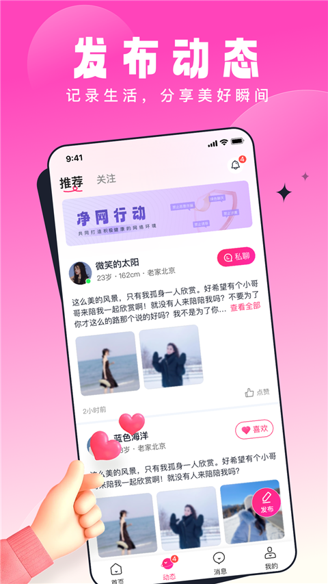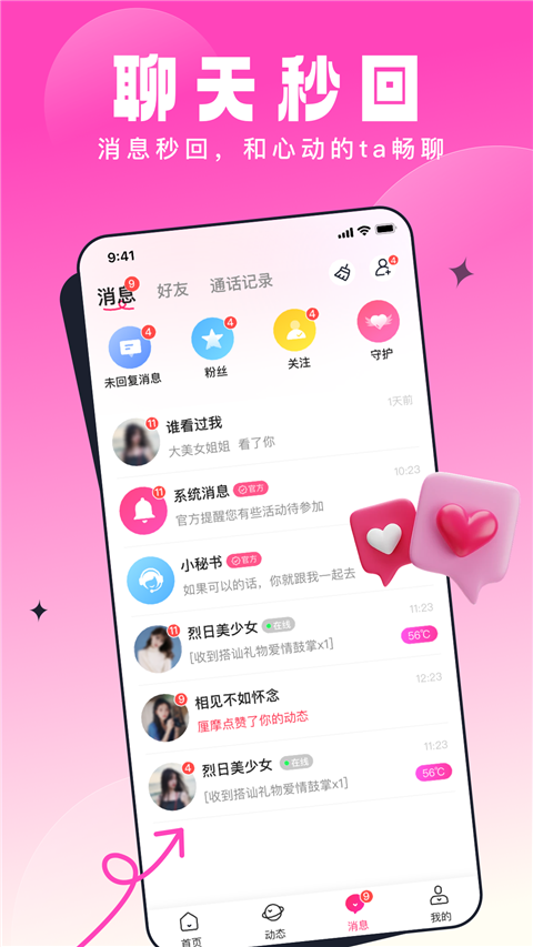乡缘App是一款聊天交友平台应用,通过它用户可点击查看推荐的账号头像、年龄信息,若是感兴趣的话可随时私聊,与TA发起浪漫对话,通过文字、语音等聊天方式进一步了解TA。乡缘交友平台提供实时消息提醒,用户可第一时间接受到对方的消息,让每次聊天不再有时间差。