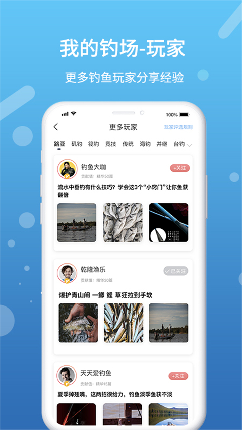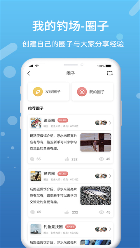 1、可以从中学习更多关于钓鱼方面的技巧知识,提高广大钓友们的钓鱼水平。 2、投其所好,创建自己的专属圈子,与其他钓友打成一片,分享更多钓鱼动态。 3、厂商可以在线管理钓场,通过平台宣传钓场,让更多钓友参与进来,钓出精彩。 4、提供了专属的钓鱼社交圈子,在圈子中可以结识更多小伙伴,发动态,晒心情。 5、这里拥有排行榜专栏,你可以查看该钓场中排名靠前的钓鱼大神,学习更多钓鱼知识。软件亮点