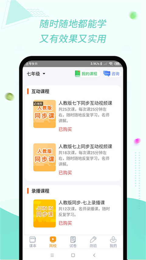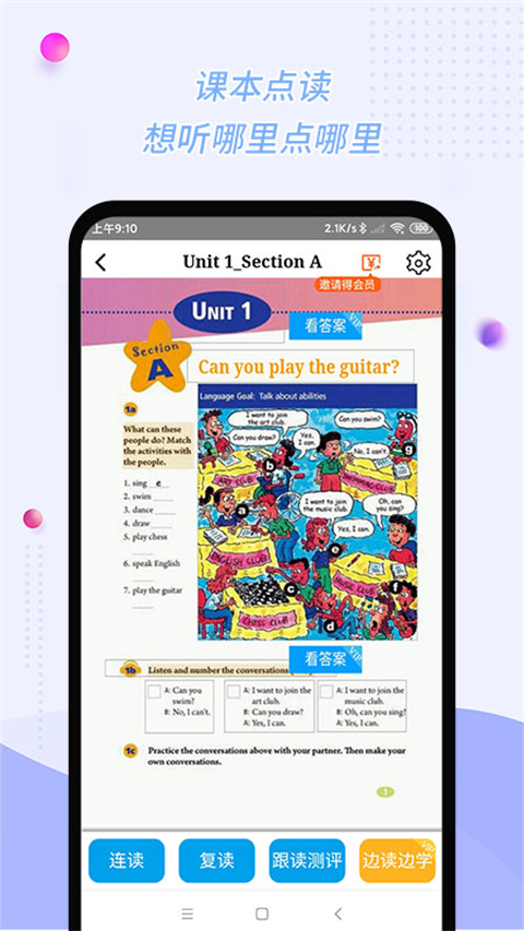 1、课本听说读 覆盖大部分课本教材,支持课本点读、连读、复读、跟读;还可放大课本句子,查看单词词典。让您轻松搞定小学英语; 2、单词卡片 涵盖所有小学单词,提供我来读、我来拼,听说读写全方位学习单词; 3、测验 慧话宝定期发布测验,精准测评,学生在手机上做作业,回顾作业,错题举一反三,消灭易错知识点; 4、直播课程 开设了Join in 同步课,慧话宝自然拼读等课程,与老师进行课堂互动;不定期还会上线一些免费课程哦; 5、会员 深度学习英语,帮孩子们会听会说又会考。购买会员还送直播券哦。软件亮点