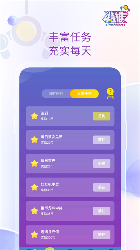 1、每天都有不同类型的热门产品推荐给用户,让用户找到更多感兴趣的产品。 2、充分享受刺激和愉快的娱乐体验,体验这种充满乐趣的在线抓娃娃。 3、该软件为用户提供了多种机器,如娃娃机、动画主题、新潮玩法、日用、手摇、玩具、配件等。 4、可以直接充值游戏币玩,所有的片段或者抓拍都可以邮寄到家。软件功能