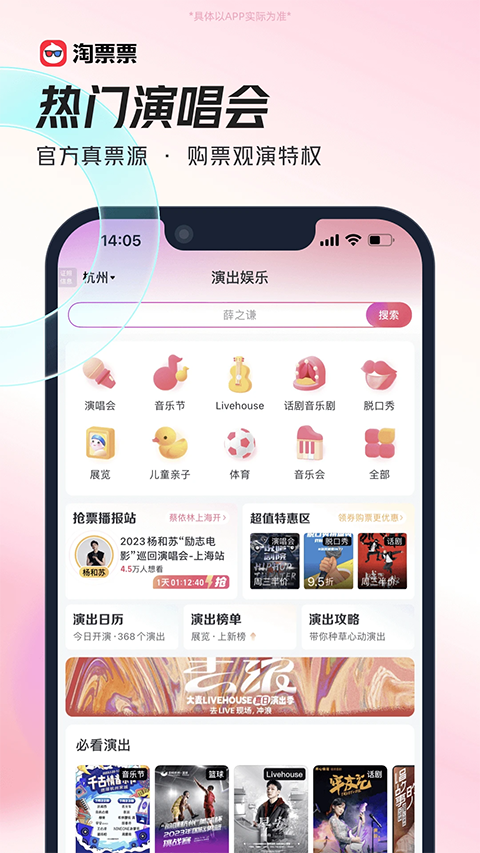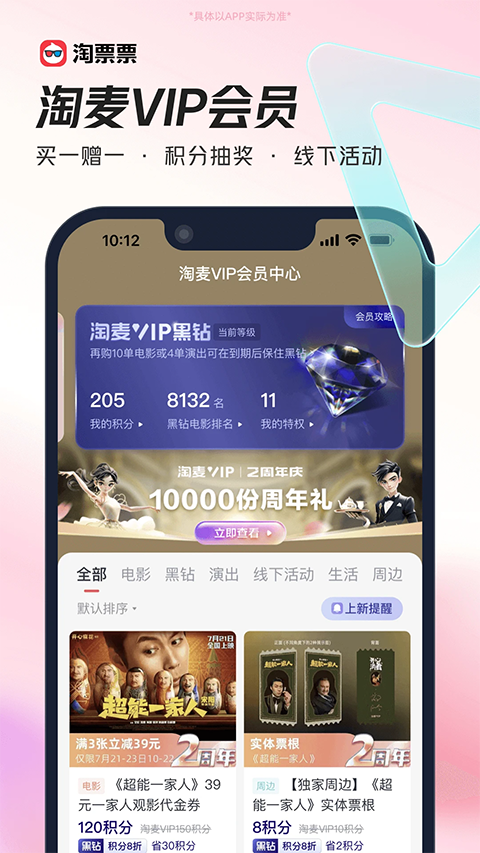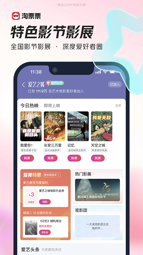 1、【热门电影,在线选座】 已覆盖9000+ 影院,让你享受快速低价的购票体验 种草视频电影花絮,丰富多彩 2、【演出真票源,特权抢购】 丰富的演唱会,音乐节,话剧歌剧,展览等你选择 不要犹豫,去现场为所爱吧 3、【淘麦VIP会员,权益满满】 覆盖「电影+演出」更多权益,观影观演优惠券、买一赠一、积分抽奖、丰富线下活动等 4、【快看视频,发现好电影】 用更轻松的方式,发现适合你的好电影 院线好片、网络大片、全球热门电影尽在淘票票快看视频 5、【爱艺之城,艺术电影的家】 看艺术电影、影展、电影节就在“爱艺之城”软件功能