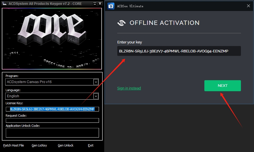 9、进入软件界面,弹出激活对话框,将注册机的“License Key”复制到对应框里,然后点击“NEXT”。