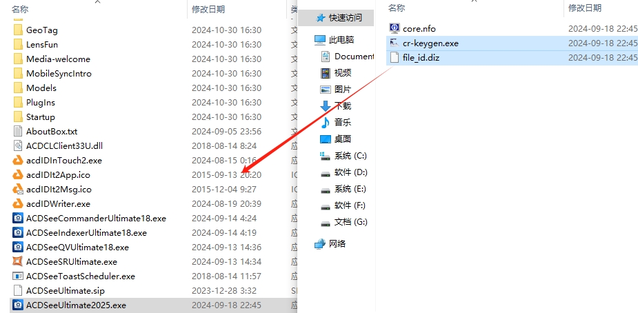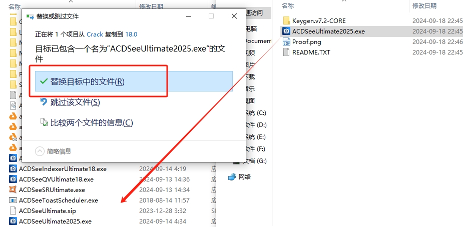 5、打开软件安装目录,将安装包Crack文件夹里面的“ACDSeeUltimate2025.exe”复制到刚才打开的安装目录位置下替换。