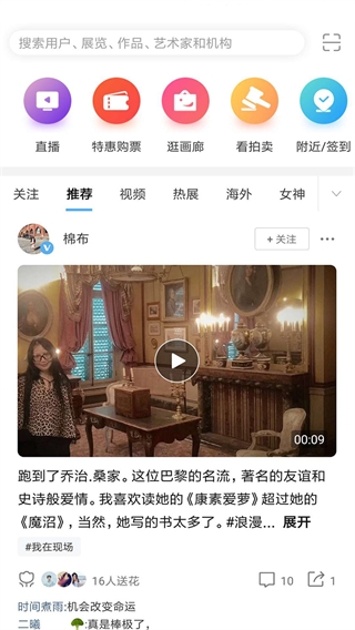 1、搜索功能可以快速找到目标内容; 2、在线观看艺术达人直播,发送弹幕提问; 3、购买需要的门票,参加艺术品展览; 4、点击观看拍卖会,了解最新艺术品价格; 5、点击打卡签到,还能查看附近艺术机构; 6、可以关注喜欢的用户,获取更新提醒; 7、推荐最新动态信息,喜欢可以送花留言。更新日志