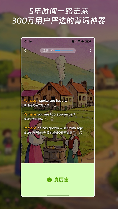 1、全新的AI智能遗忘算法,准确评估每个单词的学习进度; 2、创新颜色块设计,让美感与实用性完美融合; 3、采用更加科学客观的方法来反馈用户的学习水平和勤奋程度; 4、全网最新最全的词库,包涵200多万词汇; 5、众多单词应用里的一股清流,无登录,无社交,无签到,无游戏,无课程推销等无关干扰功能,聚焦背单词核心体验; 6、每项功能都经过严苛的测试与打磨。细节追求完美,力求为大家带来最沉浸式的体验。软件亮点