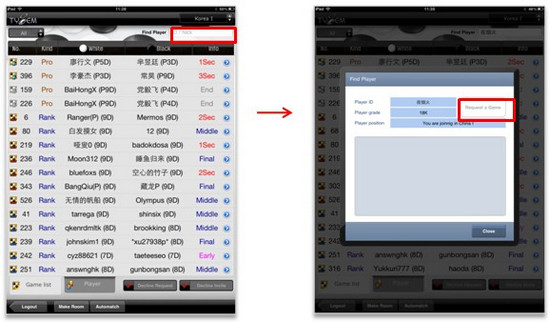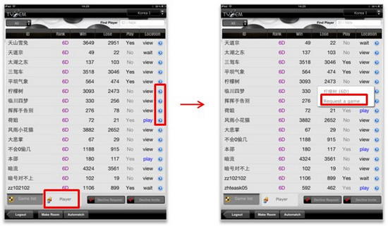 1)在大厅查找用户,在用户信息窗口点击“Request a Game”发送对局申请