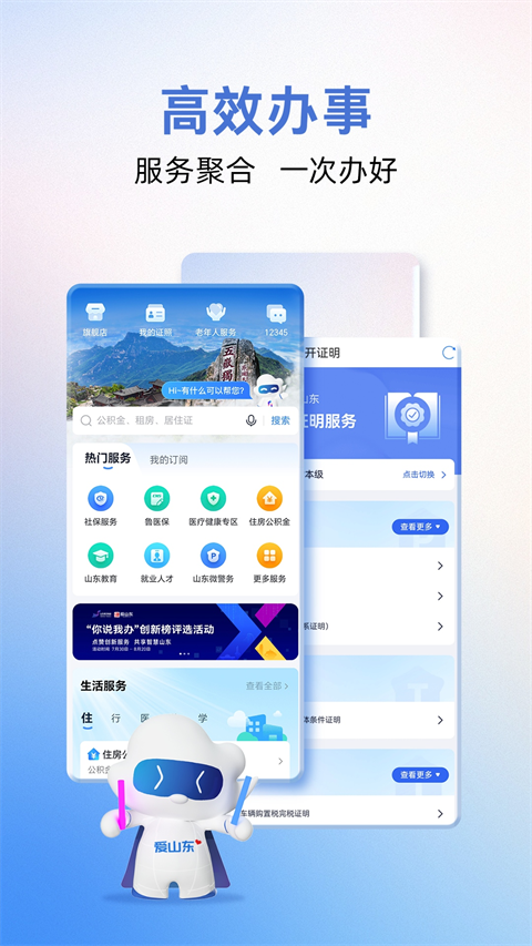 1、办事服务 对接各级政务服务平台,提供政务服务办事引导、进度查询等“掌上查”服务; 2、信息服务 对接各级政府门户网站,提供最新资讯“随手看”服务; 3、互动服务 对接各类咨询服务系统,提供投诉、投票、问卷调查等“随时问”服务; 4、便民服务 对接各级应用系统,提供水、电、煤、暖等热点便民交费,机动车罚款缴纳,缴费纳税等“即时办”服务。提供多种多样的查询服务,方便居民查询个人社保、公积金、公共信用名单、教育考试成绩等信息; 5、个人服务 对接省统一身份认证平台,提供与个人事项相关的“我的”办件等“贴身行”服务。以往办理业务需要携带许多证件材料,30余项电子证照将在11月底全部亮证,这些电子证件均可通过爱山东APP领取。目前已经提供了包括电子驾驶证、电子身份证、电子出生医学证明、医护人员执业证书等在内的电子证照。这些电子证照将极大解决出门忘带证件等难题。功能介绍