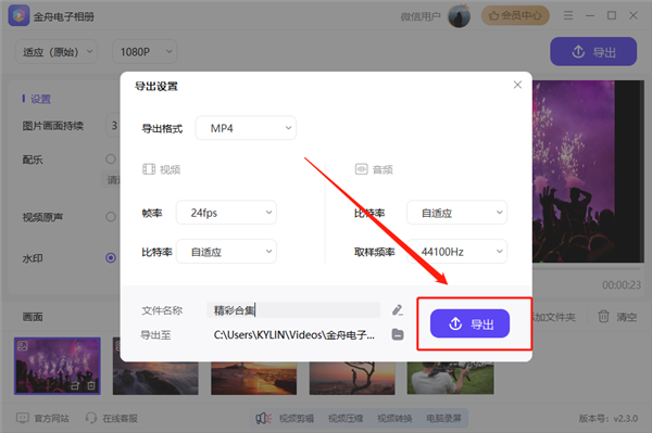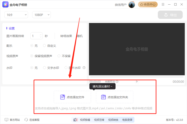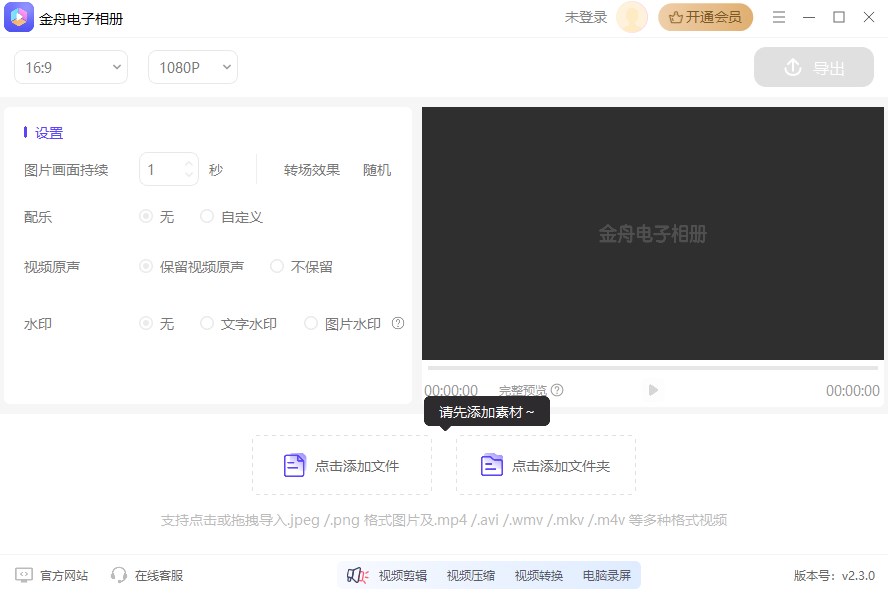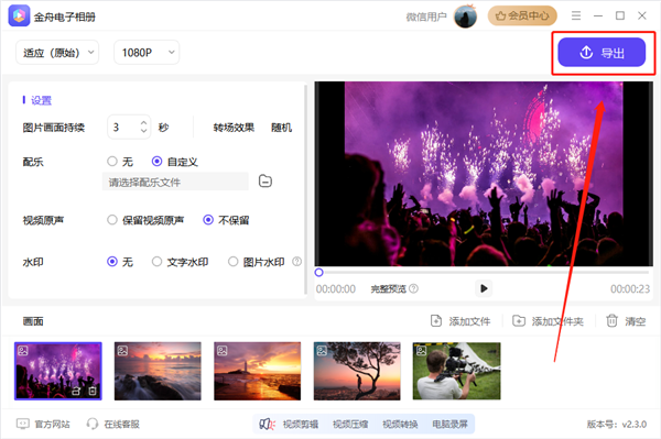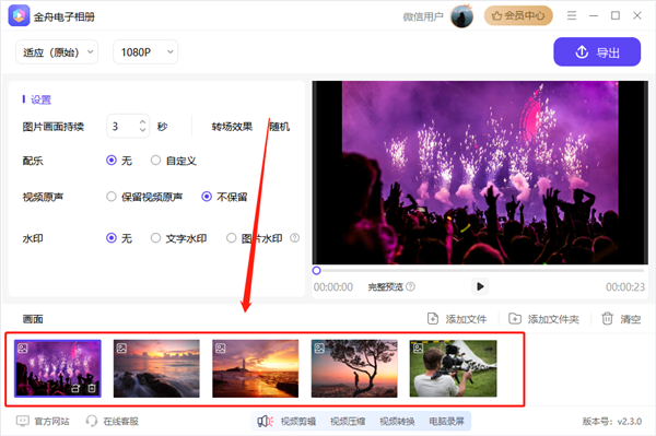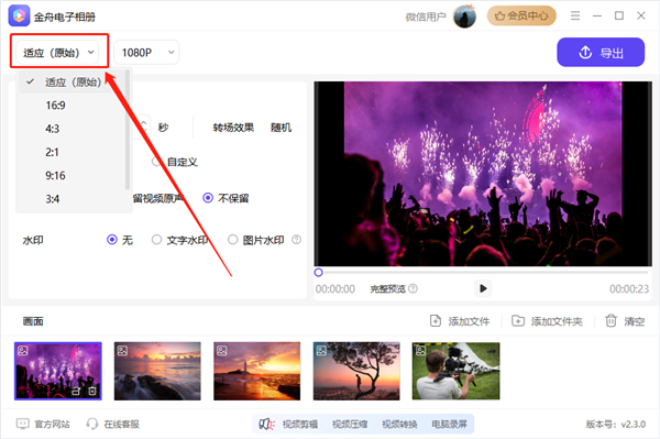 1、一键导出视频 只需5分钟,添加素材(照片/视频),无需更多操作,就可一键出片。 2、无损高清导出 支持4k视频制作,支持多种视频比例、多种视频格式,兼容各大主流视频社区。 3、海量转场随机 提供海量转场,包含淡入、淡出、幻彩、闪烁等,各种风格都有。 4、自由添加背景音 支持自由添加背景音乐,想用什么音乐由自己控制添加。 5、自由添加水印 支持增加文字水印、图片水印,种类自由决定,多个位置可选。金舟电子相册官方版使用教程