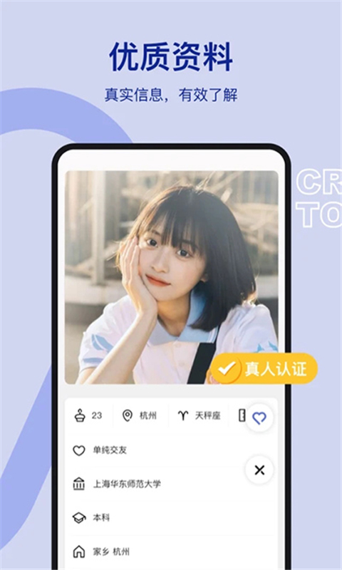 1、提供真实信息和有效了解,让用户可以更好地了解对方。 2、支持一键匹配和优中选优,帮助用户找到理想的ta。 3、可以隔绝无效聊天和屏蔽恶意骚扰,让用户在更多时间中安静的双向奔赴。 4、提供真心问答功能,帮助用户更好的了解对方。 5、有很多的用户会在线分享自己的生活,帮助用户可以更好的在线扩大社交圈子。更新日志