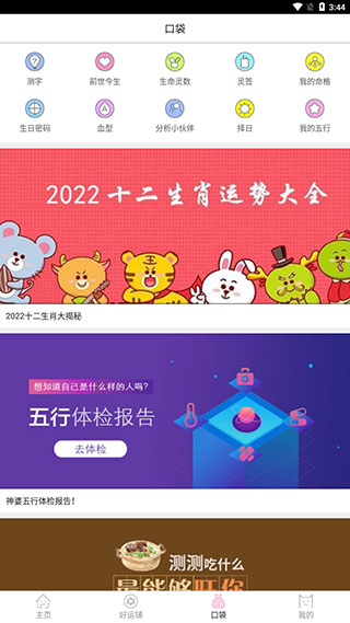 4、【口袋】页面则是提供了多种运势分析功能,如测字、前世今生、生命灵数、生日密码等。