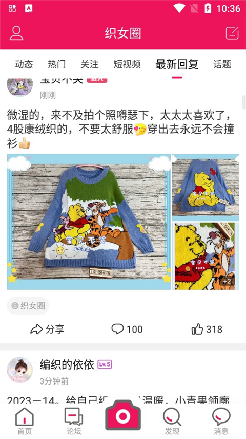 9、在发现一栏中,有别于以上介绍到的首页、论坛和织女圈,在这里线上的网店可以买到真实的手工编织作品,而且你还可以自己开店,或在线学习,或参与与编织相关的问答,亦或者关注自己的感兴趣的圈子,第一时间了解动态!