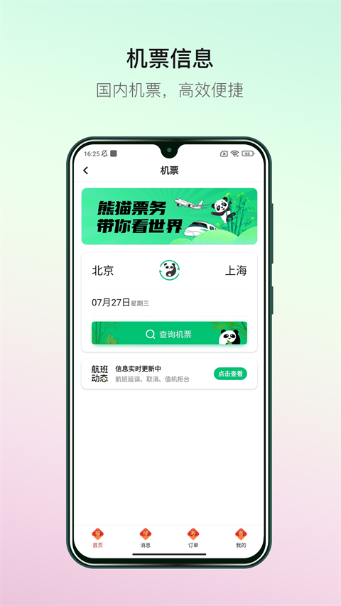 1、【机票】一站式预订查询机票,一手掌握订机票订酒店抢购火车票预定信息。 2、【特价机票】特价机票查询订购预定,订低价特价飞机票,特价机票,机票选座等服务。 3、【火车票】火车票查询,离线抢票、助力抢票、提速抢票等让抢票春运不再怕。 4、【抢票软件】准点抢火车票,火车票预订普通车次、高铁、动车信息实时查询,专业准时不误车,火车票抢票超给力。 5、【酒店】订酒店,来熊猫。全球酒店预订短租房、日租房,订周末酒店,特价酒店住宿预订等酒店预订服务。 6、【景区门票】全国低价旅游景区门票5折起,交通用车、团游自驾游、当地娱乐体验等当地旅游特色。北京环球影城门票无需您出手,熊猫票务免费帮您抢门票。 7、【邀请有礼】新用户成功注册APP免费领100元红包,邀请好友成功注册后还有机会获得500元红包,最高可累计获得600元,先到先得。熊猫票务app在线购票指南