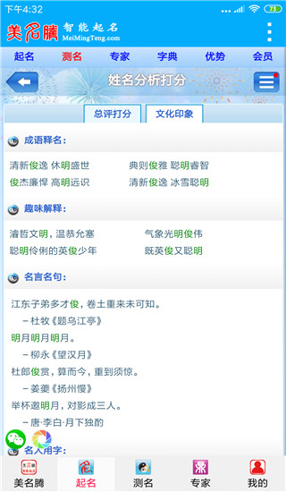 1、美名腾的优势: 六度空间起名法,传统和现代完美结合; 《诗经》、《楚辞》、《论语》、成语等典籍起名绽放文化光芒; 真正的智能起名系统,深入理解您的起名意愿。 2、美名腾的荣誉: 江苏卫视和百度合办“沸点”十大人气应用; 百度、腾讯、360、搜狗网络起名应用提供商; 宝宝树、YY网起名和测名服务合作伙伴。 3、美名腾大数据: 上线至今累计使用超5亿次; 起名文库累计阅读量超8千万次。更新日志
