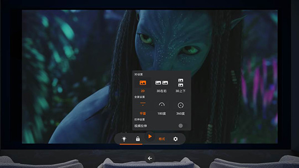 ③设置播放格式:点击播控条格式,打开格式设置面板。选择3D、全景可以切换播放画面的播放格式。如果想播放360格式的视频,选择全景设置下的360即可;选择3D左右即可播放3D左右双目格式视频。
