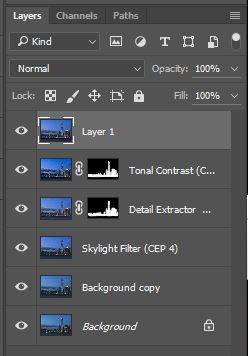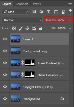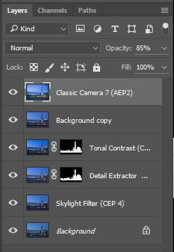 (6)完成后按OK,程序便会自动在Photoshop中加一个已加效果的图层置顶。  这张照片的第一个滤镜用了「Skylight Filter」,这会为照片加强日落、日出的颜色,建议为了避免脱离现实不要用得太强,加了后按OK。