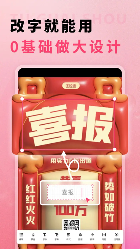 1、海量模版 40万+原创图片模板,涵盖了手机海报、名片、营销长图、电商banner、淘宝店铺首页、公众号封面、邀请函、手机壁纸、每日一签、LOGO设计等,每日更新,满足不同场景使用。 2、极易操作 选择模板,改字、换图即可完成各类场景图片制作,极易上手,会打字就能用。 3、皆可商用 正版授权,字体、插画、人像皆可商用。 4、独家字体包 独家字魂可商用字体包,一键轻松变换字体。功能介绍