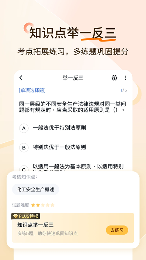 1、全阶段刷题攻略 助你快速定位当前备考阶段,选择合适做题的功能,事半功倍学习掌握考试重点; 告诉你在基础/强化/冲刺阶段应该刷什么题,怎么刷题更高效! 章节练习、每日一练、历年真题、万人模考、周周测、月月考、刷题挑战等做题功能...满足不同做题需求。 2、多模式智能练题 多模式做题系统,测验模式、学练模式、背题模式,做题时可随时切换; 做题界面提供草稿纸、计算器功能,让你答题不再切换页面,更方便流畅! 3、题点关联,错题本功能 练习过程中,每道题关联一个知识点,可以及时知晓对应学习内容的掌握程度 做题完成后,系统收集记录错题,方便重做温习,消灭错题!软件亮点