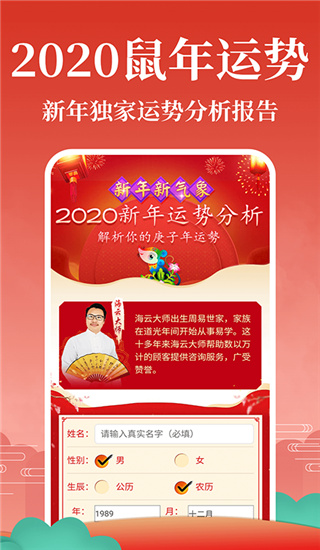 1、八字算命:该功能将详细揭晓您一生的秘密,从家庭婚姻,到学业事业,八字算命都可以详尽为您解答 2、八字运势:每日个人八字运势分析,财运、健康、桃花、学业、幸运数字等全面解读,七日运势曲线图清晰显示 3、大师亲测:云溪大师真人测算,精通子平八字、六爻卜卦、风水布局、奇门遁甲及起名择日 4、周公解梦:周公解梦将详细为您解释梦境中的一切,让您不再对梦产生疑问,让梦预见您的未来 5、爱情配对:丰富多彩的配对方式,让您更了解爱情的未来 6、求签断事:遇到疑惑不解之事,求签断事能让您不再迷惑,为您前进指明方向 7、姓名五行:发现您姓名中的秘密,知晓姓名对人一生的影响 8、中华万年历:不仅让您更多一点了解中国传统日历、老黄历,八字择日方便日常生活,更可以通过八字挑选出适合你的好日子,婚嫁、开业、建房等,又怎么能少得了呢,再也不用花几千块找日子先生了 9、面相分析:面相,口(嘴)相,鼻相,眉(眉毛)相,眼(眼睛)相等全面图解综合分析面相运势更新日志