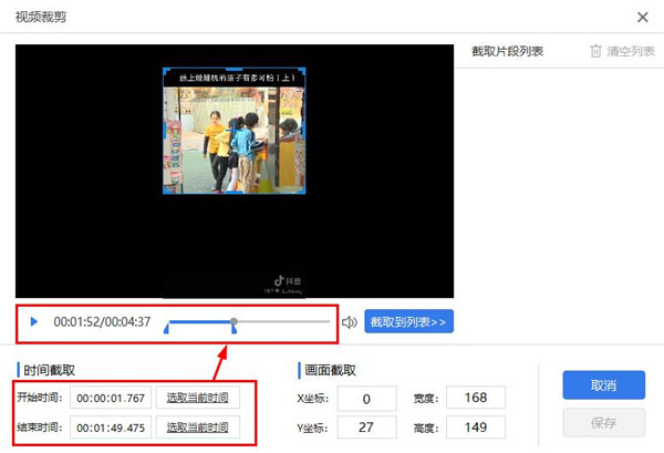 4、设置时间截取以及视频裁剪长宽度,点击保存即可
