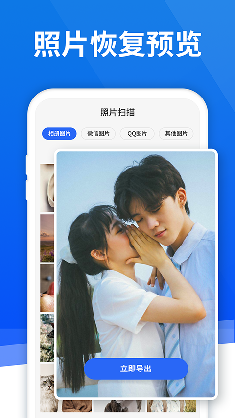 1、相册恢复:手机相册恢复、手机截图恢复、相册回收站图片恢复等; 2、微信恢复:微信聊天图片恢复、朋友圈照片恢复等; 3、QQ恢复:QQ聊天图片恢复、空间照片恢复等; 4、其他恢复:网站保存至手机的图片; 5、更多功能:手机&微信&QQ各类视频、音频、文档等快速查找。软件亮点