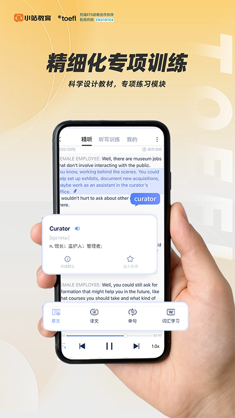 【免费托福口语批改】 免费提供托福口语批改,资深托福名师及时免费批改。 【托福名师微课堂】 托福名师大咖公开课微课堂视频,与你面对面分享托福学习经验与干货。 【口语录音公开排行榜】 支持口语录音公开,并可查看学友排行榜,查看不同角度的答题方式,更加激励自己。三人行,是否有我师,比比才知道! 【支持查单词、记录分类生词】 阅读、听力支持查单词,并可添加到生词本随时温习复查,生词可自定义分类,轻松搞定TPO单词, 具有预防健忘症的独特功效,不收取任何诊疗费,你值得拥有! 【详细答案解析】 《小站教育》从业多年的一线顶级托福教师独家编译,更加详细权威标配的阅读解析,听力解析,并附带原文答案。解析在手,做题不愁。功能介绍