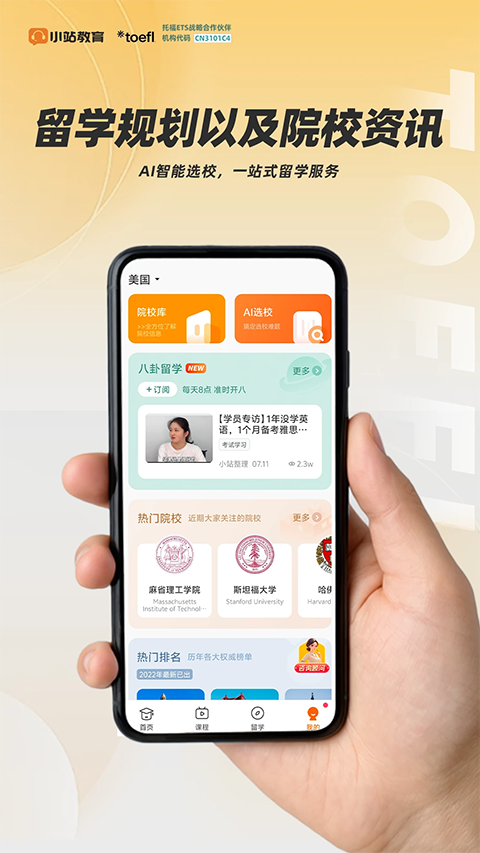 1、精选备考指南 摘选靠谱备考资料帮你知晓方法了解考情政策,解锁更多提分技巧 2、机经在线练 小站托福机经是冲刺期的重要指南。高命中率口语、写作机经在线练,帮助考生划分复习重点赢得高分 3、课程干货十足 想要短时提分?每天公开课彻底轻松预约课程,涵盖各科的托福提分课助力拿高分 4、科目专项能力 听力精听:泛听全文、听音变速划词翻译。包含 TPO 1- 71、OG、Extra 等丰富听力资源,科学方法帮助考生提升托福听力成绩更新日志