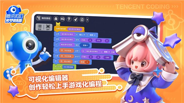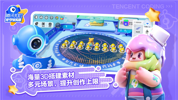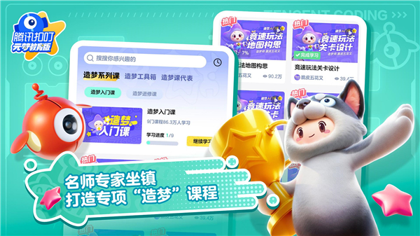 1、【元梦扣叮编程】 基于腾讯扣叮编程技术,将复杂的代码语言转化为简单的积木块,零基础也可以轻松上手游戏化编程。结合学院、课程、社区打造一站式学习平台,——在这里,人人都可以成为优秀的数字创作大师!