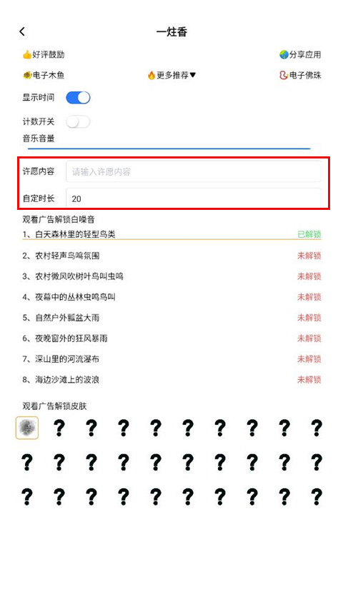 1、香会在一定时间内烧完,一炷香的时间可自定义 2、烧香过程中可选择不同的白噪音背景音乐 3、可设置不同的烟雾颜色一炷香app如何设置时间?