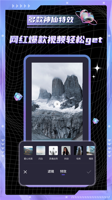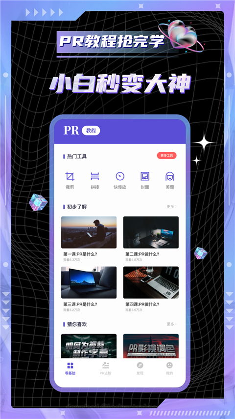 1、视频编辑,快捷简单,一键制作热门视频。 2、多款神仙特效,网红爆款视频一键get。 3、丰富质感素材,每天都有新灵感,创意无限。 4、PR教程抢先学,小白秒变大神。更新日志