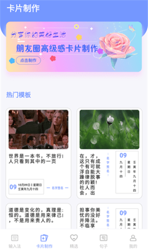 【卡片制作】 打造您的高级朋友圈。APP里提供朋友圈配图、朋友圈文案,您也可以选择自己的图片或自己编辑文案,添加上图片边框、签名,一张高级的朋友圈卡片制作即刻完成。您可一键保存或分享至朋友圈。 【海量句子库,文案内容丰富】 精美的句子、文案、诗词、诗歌、座右铭、语录、祝福语。 句子文案内容丰富,分类多样,满足您的不同需求。AI创作,海量好句收录,无限文案素材合集。励志经典语录、情感文案、早安语录、晚安语录、朋友圈文案、名人名言、电影台词、金句,还提供各类祝福语。总有一句文案能够打动你,总有一个句子能够触动你。 【每日金句】 每日一句,AI创作,方便您阅读、收藏、积累文案句子、作文素材。影视摘录,诗词素材摘抄,随时随地摘抄好句,收藏记录,沉淀自己。 【不折叠输入法】 提供朋友圈文案不折叠、发圈不折叠的功能。操作便捷易上手。句子文案控app介绍