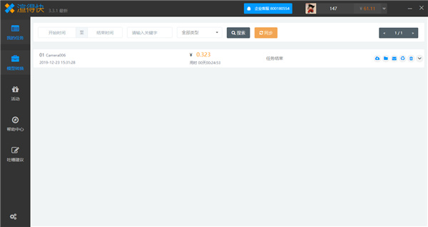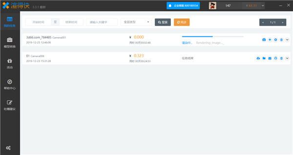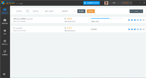 12、(范例)当任务渲完之后,软件会自动回传结果。用户可自行下载渲染结果及查看订单详情,如下图: