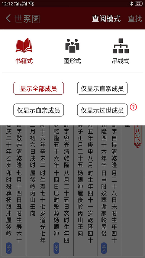 1、简单易用 ①支持多端口编修:电脑、手机皆可编修,电脑端地址zp.huaien.com。 ②支持多人同时编修:添加管理员,与族人一起编修校对家谱,省时省力。 ③智能校对,记录可查:智能分析校对修谱数据,减少家谱出错;修谱数据可查,数据可修改,大胆放心。 ④数据云端同步:随修随改,家族新添子媳,随时录入,云端数据同步更新,永远呈现家族最新情况。 2、功能强大 ①显示模式多样:书籍式、图形式、吊线式一键转换,直系、血亲、逝世成员一键显示。 ②适应各种特殊情况:失考、旺丁、多妻、入赘收养、过继、兼嗣、姻亲转血亲等复杂关系,轻松录入。 ③隐私安全:科技支持云端异地备份,数据长久保存,注重隐私保护的访问权限规则。 ④专业技术:流畅运行专业技术,海量数据,运行流畅,合理设计,智能查阅。 3、支持导出打印 ①导出模板灵活多样:苏式、欧式、牒记式皆可选择,导出模板还可以根据需要自由编辑。 ②支持PDF格式导出:支持PDF电子档导出,用户可自己选择打印成纸质家谱。 4、家族信息查询 ①世系图查询:家族宗亲关系清晰,宗室信息一目了然,宗亲成员皆可看到且看懂。 ②文献资料查阅:了解家族发展历程,瞻仰先辈光辉事迹,弘扬家风,传承优秀家族文化。 5、亲人日常交流 ①生活趣事,轻松分享:生活中的趣事,宗亲之间轻松分享,拉近距离。 ②家族日历,生日通知:全族生日统计,宗亲生日系倒计时,生日通知,不会因为忘记亲人生日而烦恼。 ③亲人互动,感恩族亲:生日、佳节问候,互赠贺卡,请安卡、小纸条、时光信箱,向长辈表达感恩之情。 ④家族聊天,拉近距离:通过家族圈进行族内交流拉近距离,无论身处何方都有家的感觉。 6、个人资料记录 ①时光轴记录:个人时光轴记录人生重要时刻,温暖回忆长久保存。 ②个人资料信息备份:云端数据保险箱备份完整珍贵回忆,不怕回忆随时光流逝不在。常见问题