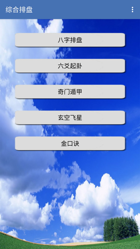 综合排盘App是一款多功能排盘算卦手机工具,它在提供八字排盘、六爻起卦、玄空风水、六壬金口诀、奇门遁甲等算卦功能的同时,还准备了专业全面的命理预测和风水分析服务,可满足用户多样化算卦需求!