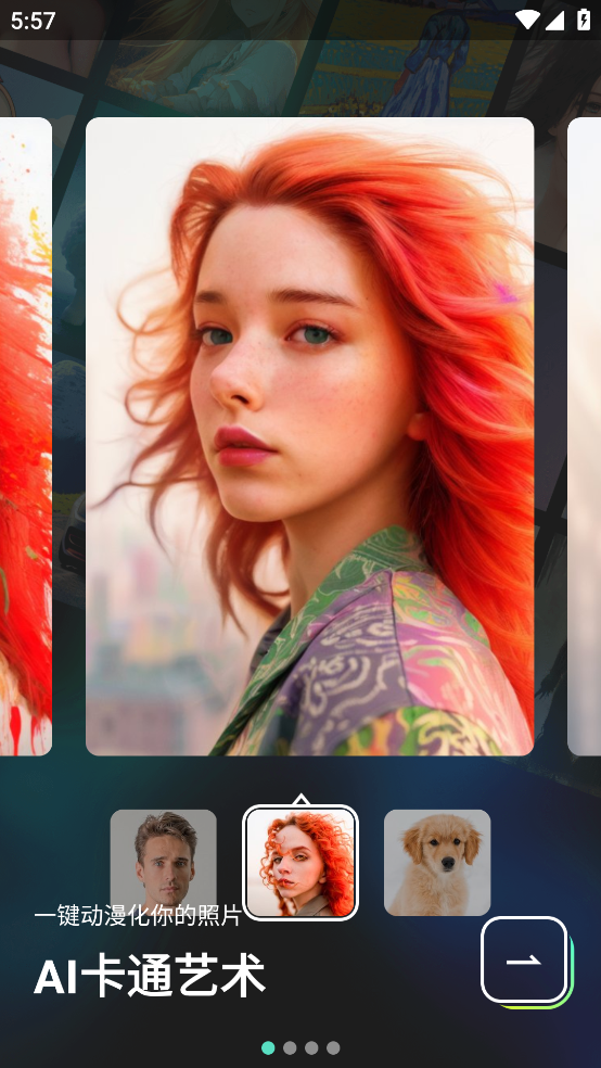 1、进入软件即可看见多种画风介绍,无论是AI卡通、还是艺术类型都是应有尽有
