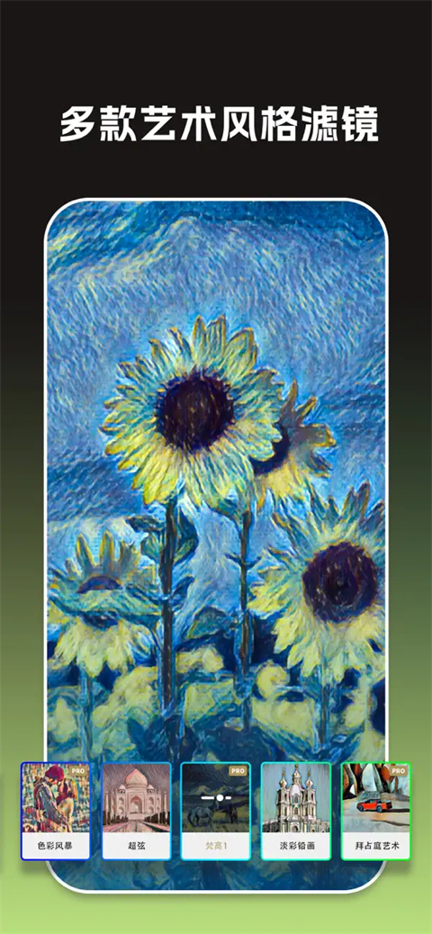 1、技术层面遥遥领先:全球首个实现1000万像素高清大图的AI引擎算法艺术滤镜,轻松创作艺术画。 2、稳定、快速、简便的一键成像功能:1000万像素大图导出,让画作打印成装饰画。 3、极速使用:让任何一张图片在短短10秒以内,就可以变成名画范儿图片,让每个人都成为艺术大师。 4、多款艺术滤镜:包含梵高、波普艺术、抽象派、印象派、素描、浮世绘…等艺术滤镜来创作艺术画作。 5、高清大图,支持打印:最高支持导出800万像素的高清图片,只要你想,甚至可以打印到衣服上大画家App使用指南