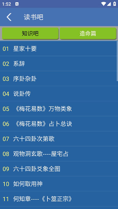 4、如果用户对卦象不太了解,可以点击右上角的三个点选择“读书吧”,查阅各种卦象知识。