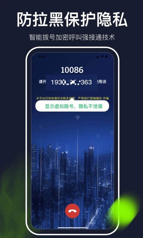 1、【功能强大】 号码防标记、突破拦截,有效打通电话; 2、【简单操作】 全程无广告,界面简洁,一拨即通; 3、【隐私安全】 虚拟号码呼出,主号隐藏,保护号码隐私。常见问题
