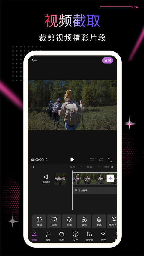 1、【视频剪辑制作】 支持视频快速剪辑、视频编辑、视频拼接、视频快慢变速、视频倒放等功能,还可以根据需求选择是否为视频添加注释、制作文字背景、字幕及编辑字体样式等,操作简单易上手,自由创作度高。 2、【海量视频模板】 拥有海量热门视频模板,创意资源特效,导入图片或视频即可自动生成网红、明星同款视频,定期更新热门模板素材,紧跟热点。 3、【全能后期制作】 拥有超专业全能后期制作、视频快慢变速、音乐剪辑、视频合并、音乐相册、卡点视频、拼图特效、视频海报、相册制作、产品视频、广告视频制作等都可支持,是您的涨粉神器。 4、【多种视频工具】 提供丰富多样的视频工具,视频去除水印、视频涂鸦、多格视频、画中画、超多精美滤镜、动态字幕、视频配音....等专业工具,轻松制作出下一个爆款视频。 5、【视频适用场景】 分享抖音、生日祝福、恋爱表白、婚礼视频、音乐相册、卡点视频、企业宣传;企业招聘、商品促销、盛大开业、乔迁之喜、微商宣传、产品介绍、品牌推广。功能介绍