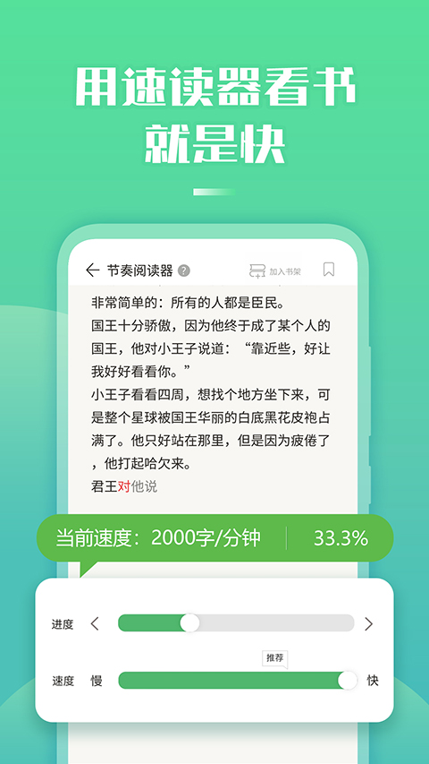 如果你是想提高学习效率的学生: 1、读书效率低,读了记不住,考试经常完不成?- 用倍速阅读APP助你拿高分! 2、学习没方法,阅读没兴趣,想拥有超强的学习能力?- 用倍速阅读APP助你拥有超强学习力! 如果你是想提高工作效率的上班族: 1、每天有堆积如山的文件需要处理,如何拥有超强的工作能力?- 用倍速阅读APP助你轻松应对各项事物! 2、职场竞争激烈,没有太多时间充电,晋升遥遥无期?- 用倍速阅读APP助你加速学习,在职场中脱颖而出! 一句话:倍速阅读APP助你离目标更进一步!软件优势