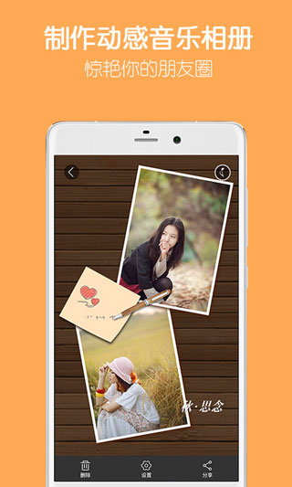 1、音乐相册 照片变成酷炫H5电子相册,一键分享至各大社交网络。 2、图文编辑 让朋友圈一次能发100张图文,精美图文排版,私人文章创作利器。 3、故事拼图 海量拼图模板,一键拼出高清作品,可以冲印哟。 4、个性杂志 制作精美电子杂志,支持印刷,人人都是大明星。 5、照片配字 轻松为每张照片加字,拍立得效果,支持分享和冲印。 6、照片冲印 一键冲印手机照片,闪电送货上门,超低价格,超高品质。软件优势