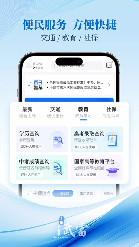 1、【交通】违章缴费、交通举报有奖、客运售票、公交查询、公交意见反馈。 2、【医疗】人民医院、太和医院、东风总医院的网上挂号、网络问诊。 3、【文化】十堰博物馆、VR博物馆、十堰图书馆、馆藏检索。 4、【个人服务】提供医保、社保、公积金、学历等等个人数据查询。 5、【公共服务】提供燃气网点、供电网点查询等公共服务设施数据查询。 6、【智能提醒】主动推送气象预警、政策解读等信息。软件亮点