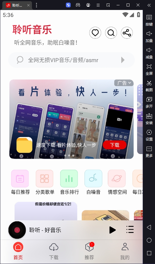 聆听音乐电脑版是一款借助安卓模拟器运行的音乐播放软件,该软件有着简洁且简约的操作界面,纯绿色使用体验并支持下载、试听、搜索、音乐预测等功能,为用户打造出纯免费、绿色的音乐平台。同时本软件有多个音源可以随意切换和内带助眠白噪音以及海量无损音乐曲库,唱享优质听觉服务,可满足不同用户的需求。