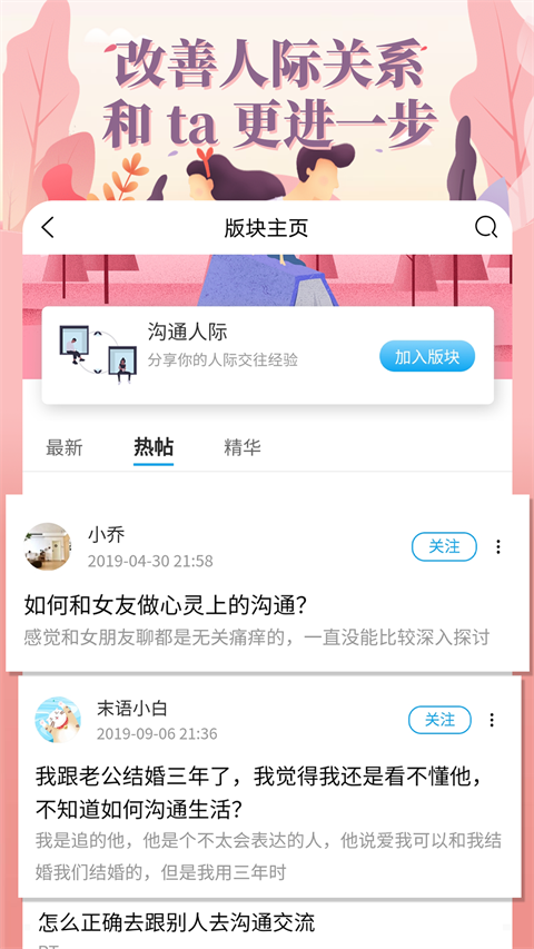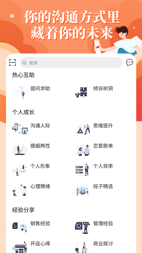 1、沟通技巧 不仅解决说什么,怎么说,语言背后的逻辑,更调整沟通的心态 2、职业职场 时代变革期,怎样把握机遇,做高薪人才,精通职场,也谈赚钱 3、心理生活 内心的状态,往往左右我们的生活、事业、感情,向内行走寻找答案 4、读书笔记 分享好书笔记、微信文章、视频节目,交流读书心得,所学所想 5、脱单恋爱 高质量的人际关系是我们幸福感的根本,让我们跟心仪的ta谈个恋爱软件特色